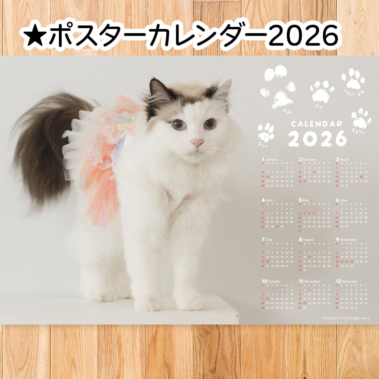 卓上カレンダー2026+ポスターカレンダー2026+スノー写真集+手帳+しおりの2026年版フルセットです。ベル、スノー、ジン、シンバ・レオ、エミリーのほのぼのとしたひとコマをお楽しみください!